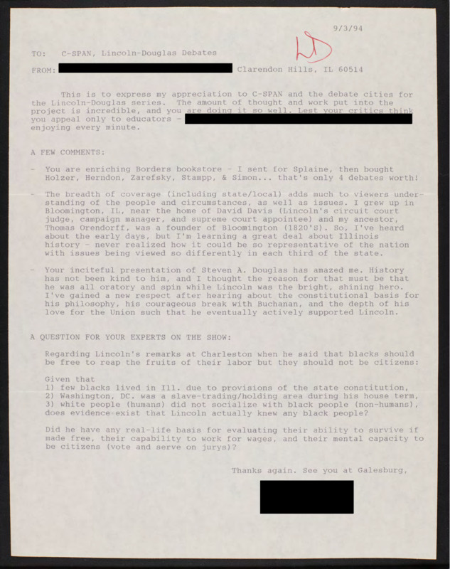 Praises the network's Lincoln-Douglas program and explains the various aspects they enjoyed. Asks a question about Abraham Lincoln's real-life experiences (or lack of) interacting with Black people.