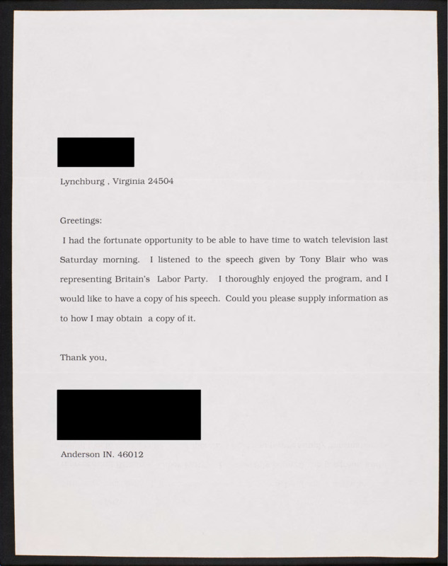 Expresses feeling enjoyment while listening to Tony Blair's speech and requests a copy of the speech.