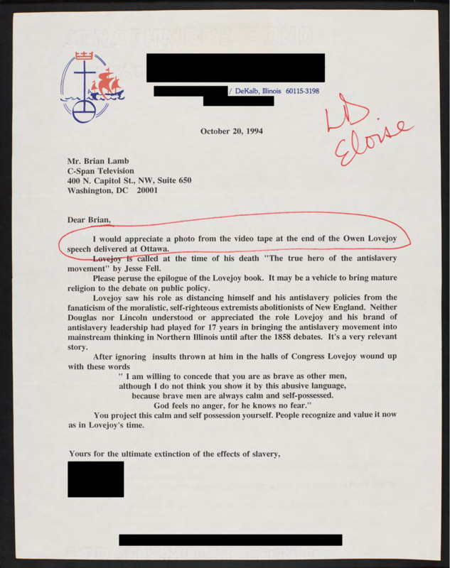 Requests a video tape copy of Owen Lovejoy's speech. Explains how Lovejoy impacted the anti-slavery movement in Northern Illinois.