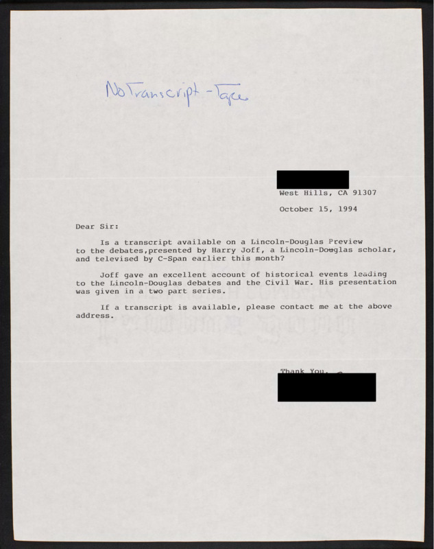 Letter to C-SPAN, 1994-10-15; 91307