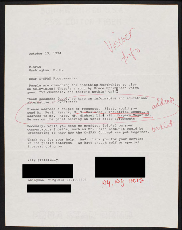 Letter to C-SPAN, 1994-10-13; 24210