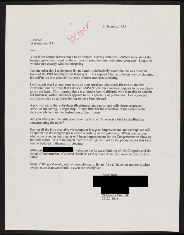 Claims Brian Lamb was not being unbiased in defending taxpayers funding PBS, then comments on a female politician they felt was rude, and discusses their opinions about the press and political parties.