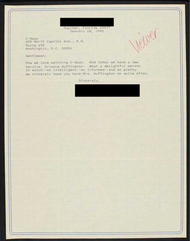 Praises Arianna Huffington and hopes she will be on C-SPAN again.