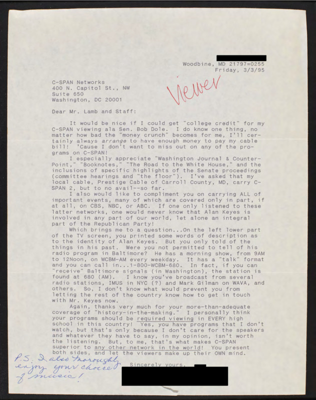 Compliments C-SPAN on various programs, including Washington Journal and Booknotes, then asks a question about a morning show.