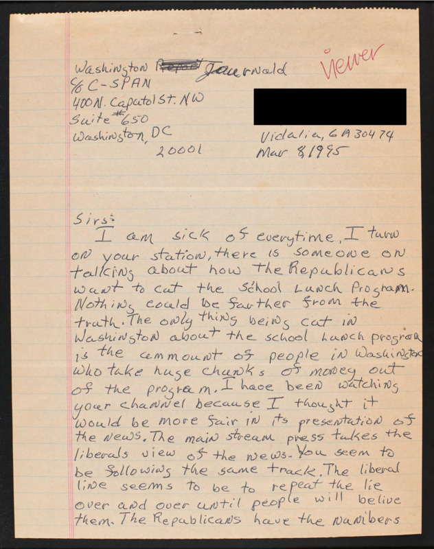 Complains about commentator saying Republicans want to cut school lunches and accuses C-SPAN of bias.