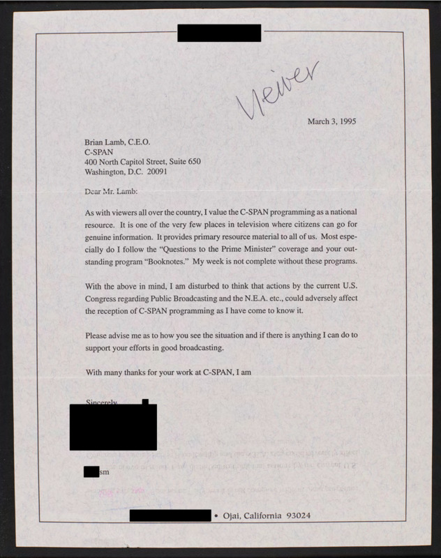 Letter to C-SPAN, 1995-03-03; 93024