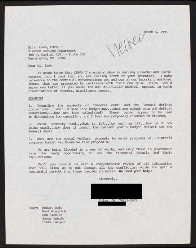 Letter to C-SPAN, 1995-03-06; 74146