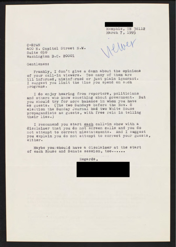 Letter to C-SPAN, 1995-03-07; 38112