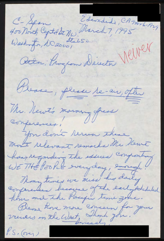 Letter to C-SPAN, 1995-03-07; 92026