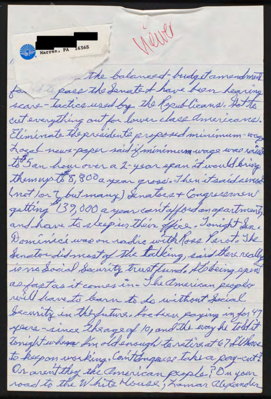 Discusses the budget and believes the Republicans pushing it are using "scare tactics."