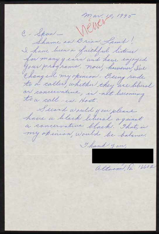 Accuses Brian Lamb of being rude to a caller, then suggests a Black liberal commentator argue against a Black conservative commentator.
