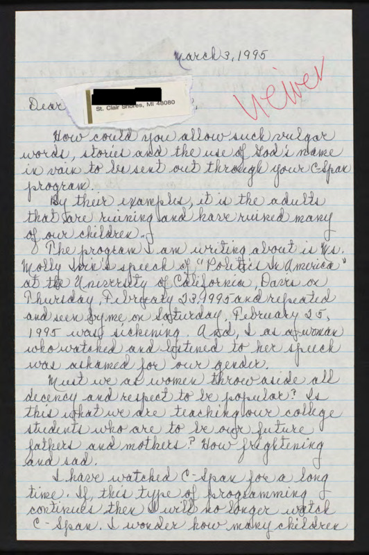 Letter to C-SPAN, 1995-03-03; 48080