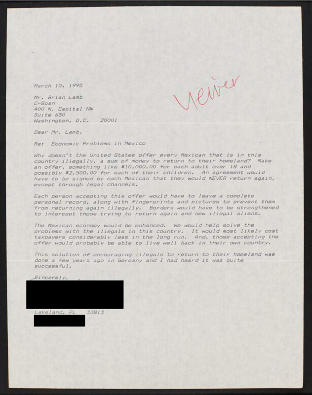 Letter to C-SPAN, 1995-03-10; 33813