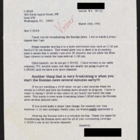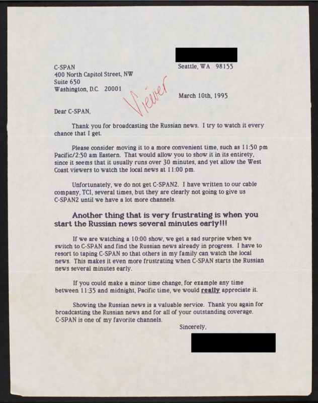 Thanks C-SPAN for broadcasting the Russian news but asks if the scheduling can be changed.