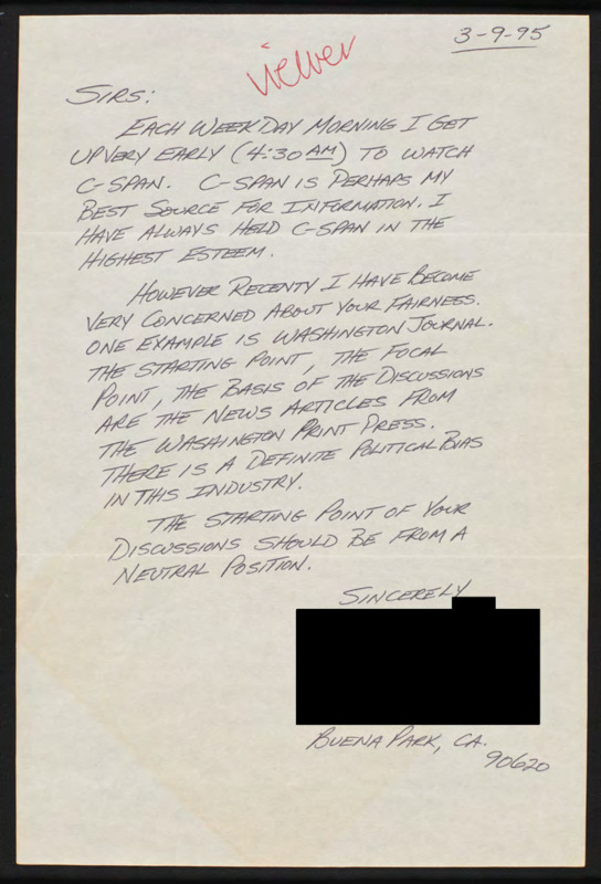 Letter to C-SPAN, 1995-03-09; 90620