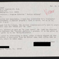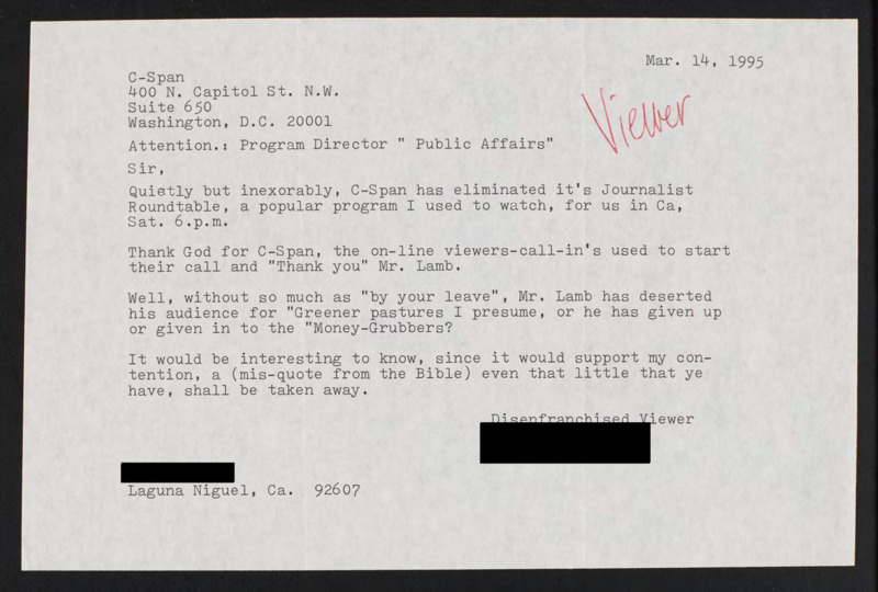 Letter to C-SPAN, 1995-03-14; 92607