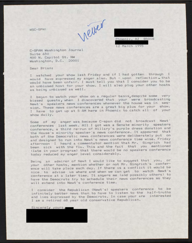 Letter to C-SPAN, 1995-03-12; 85018
