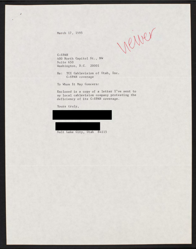 Attaches a letter to their cable company protesting their poor C-SPAN coverage.
