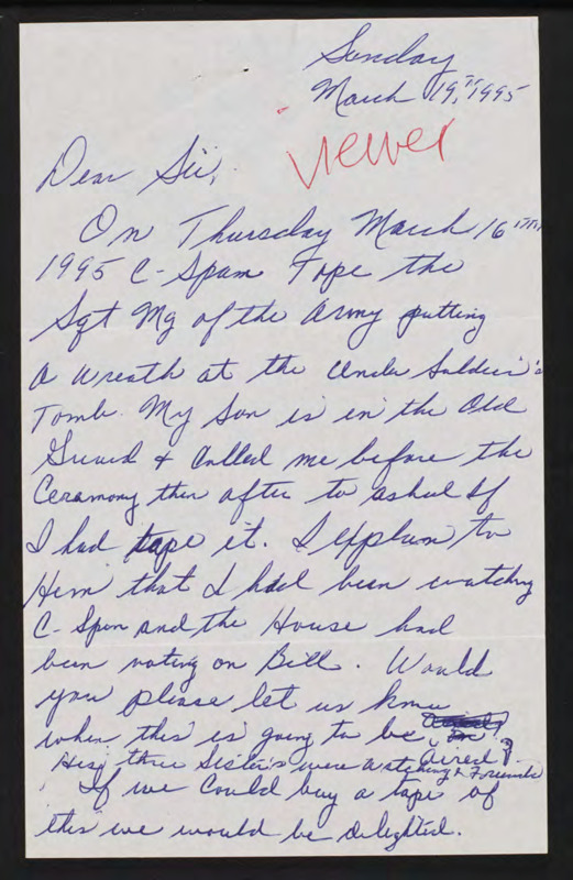 Requests to purchase a tape of the U.S. Army putting a wreath at the Tomb of the Unknown Soldier.
