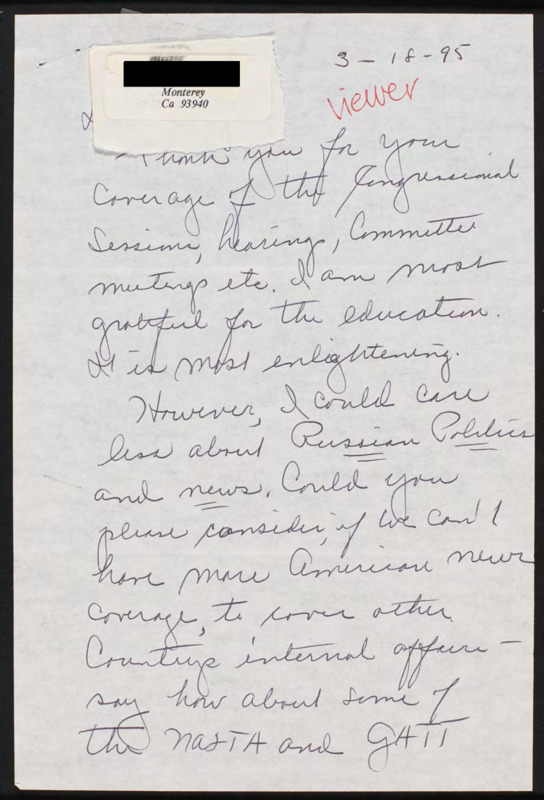 Letter to C-SPAN, 1995-03-18; 93940