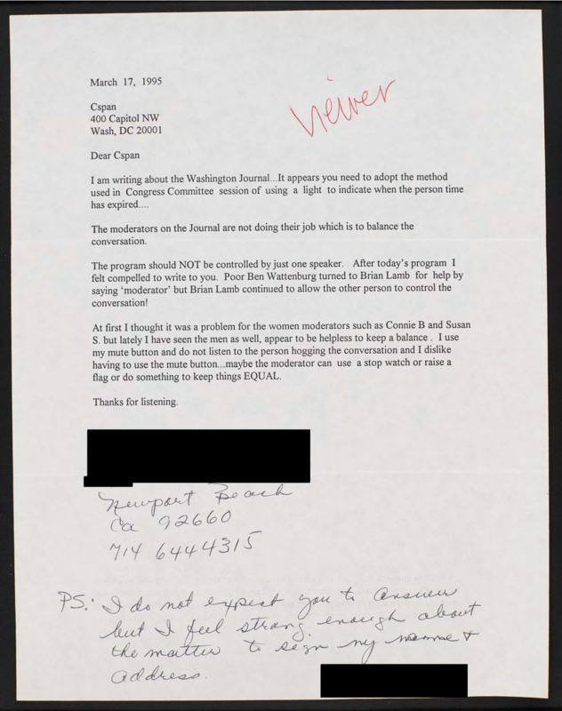 Letter to C-SPAN, 1995-03-17; 92660