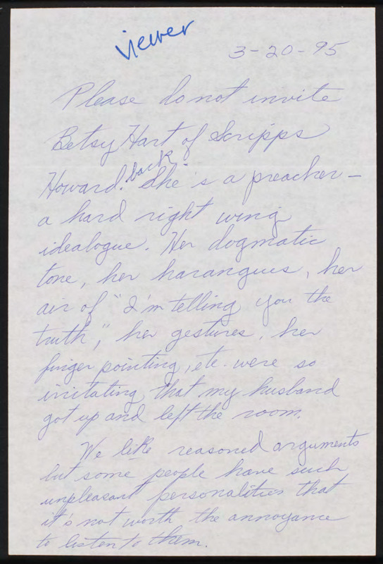 Requests that one commentator not be invited back because they felt she was a "right wing ideologue."