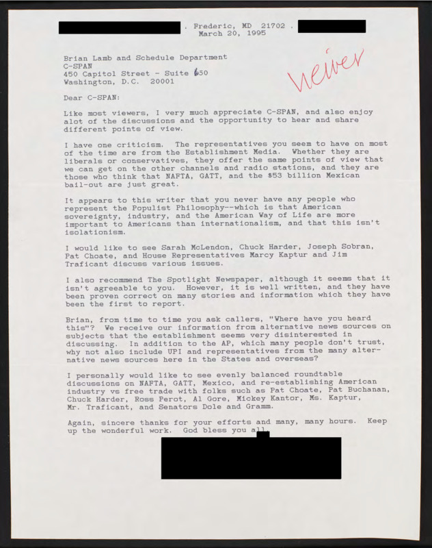 Praises C-SPAN but criticizes the choice of guests as "from the Establishment Media," and suggests other guests.