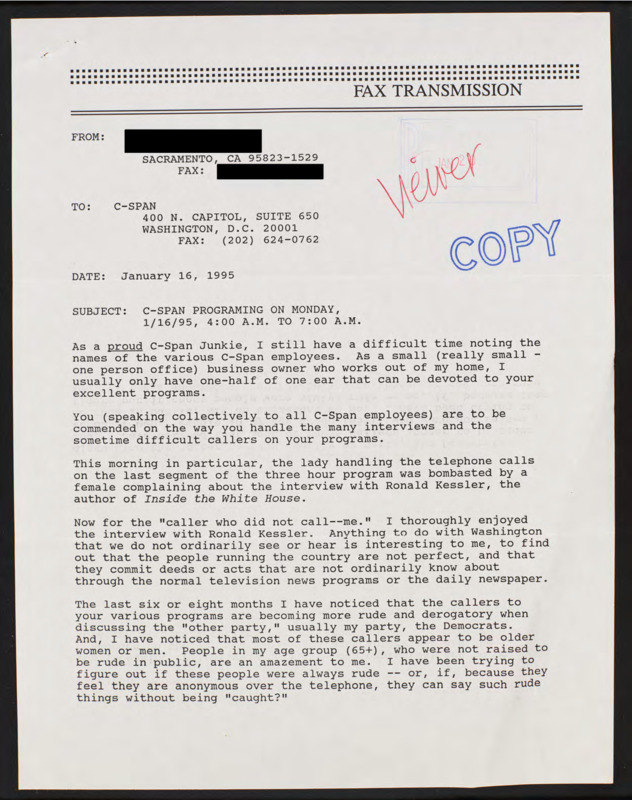 Commends C-SPAN employees, expresses enjoyment of an interview, and feels callers are becoming rude.