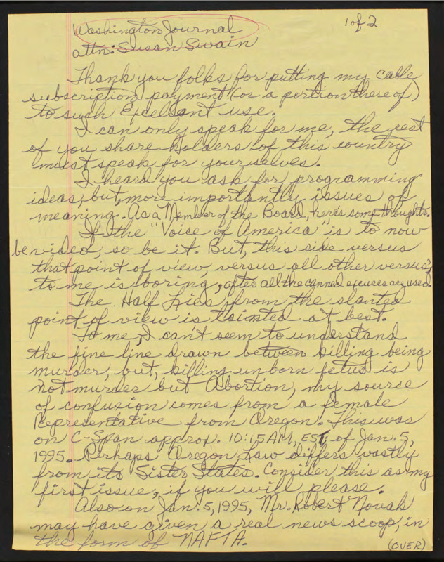 Discusses abortion, NAFTA, and other issues in relation to programs they've seen on C-SPAN.