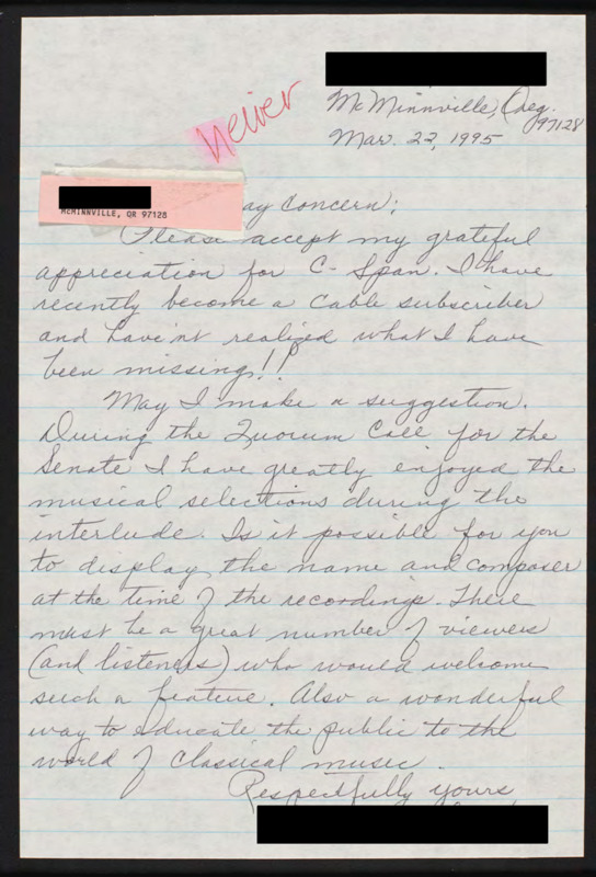 Letter to C-SPAN, 1995-03-22; 97128