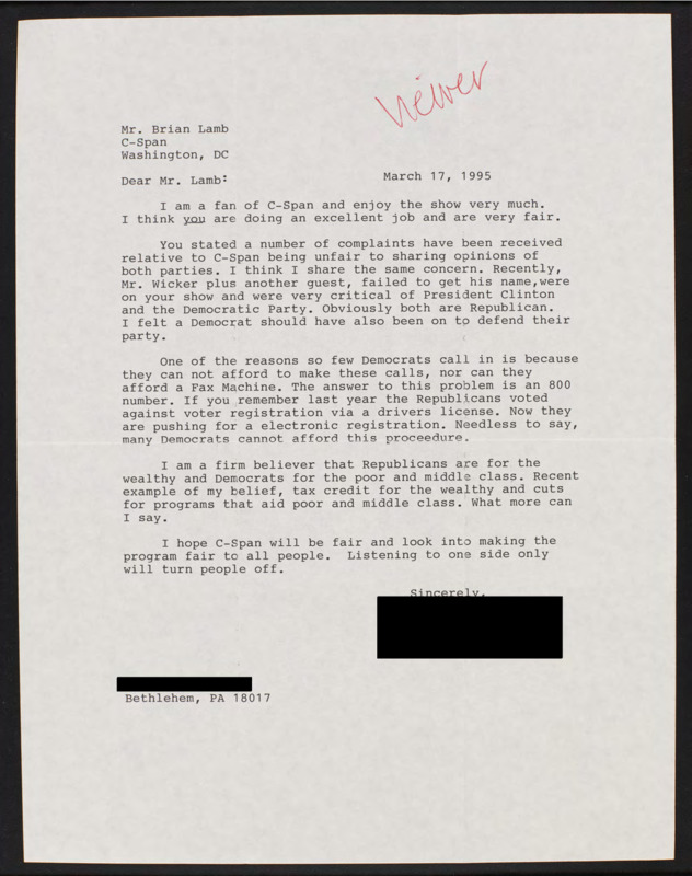 Letter to C-SPAN, 1995-03-17; 18017
