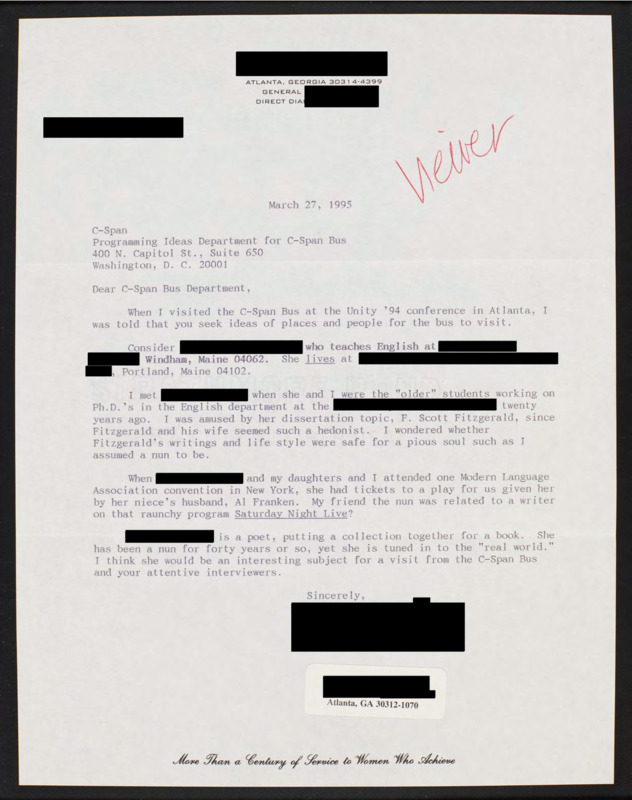 Suggests the C-SPAN Bus visit a nun teaching at a college in Maine.