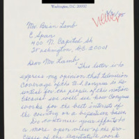 Believes television coverage of Congress is very important and encourages C-SPAN to continue their work, then mentions term limits.