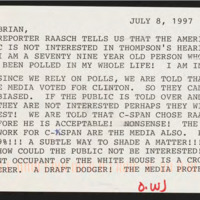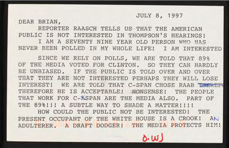 States their interest in the Thompson hearings and disputes the reported support of Bill Clinton.