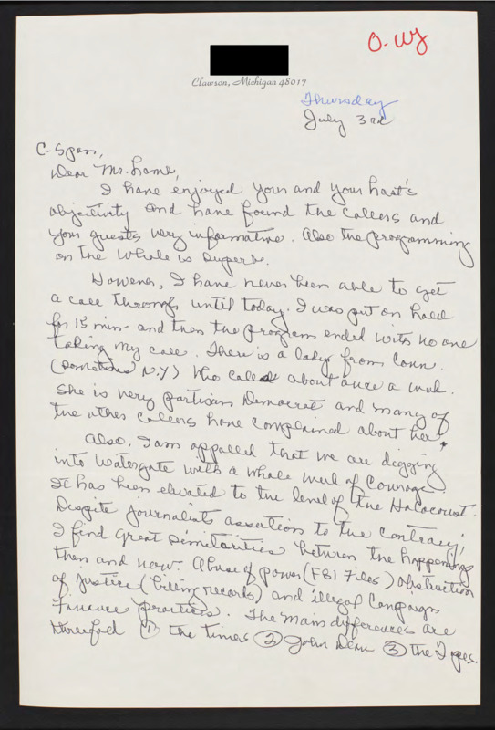 Praises C-SPAN but recounts unsuccessfully trying to call in and dislikes renewed coverage of Watergate and Ken Starr.