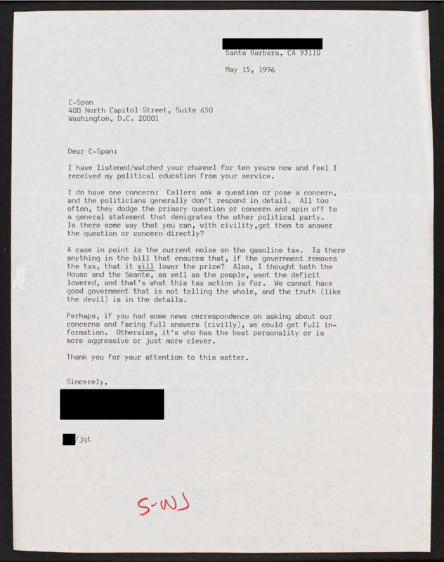 Letter to C-SPAN, 1996-05-15; 93110
