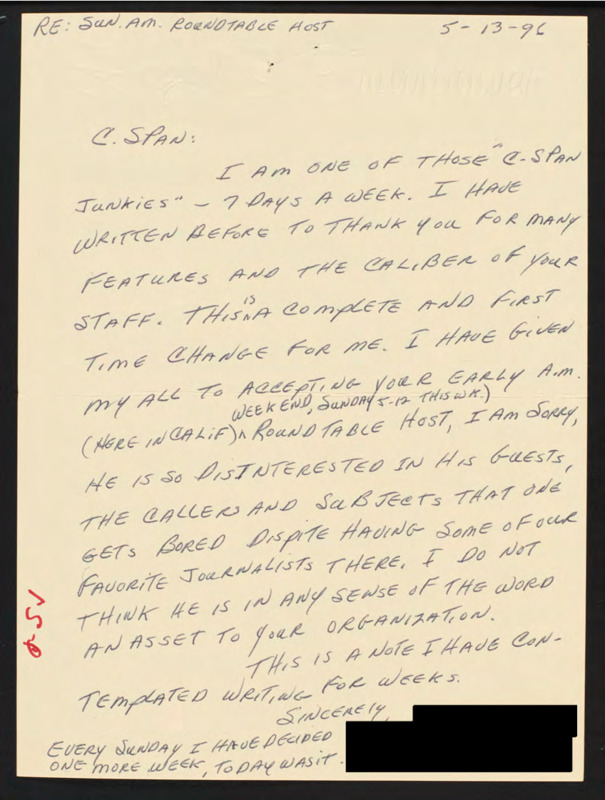 Expresses dislike for the C-SPAN host of the Sunday morning program.