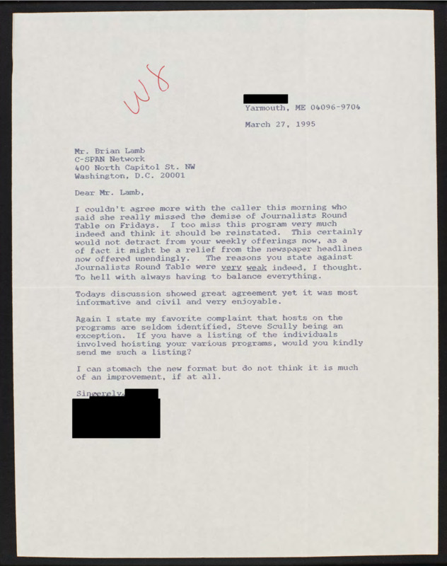 Letter to C-SPAN, 1995-03-27; 04096