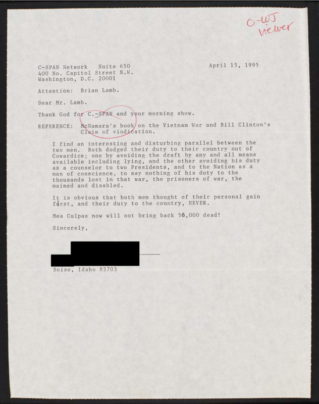 Letter to C-SPAN, 1995-04-15; 83703