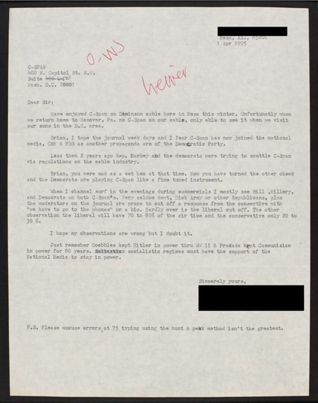 Letter to C-SPAN, 1995-04-01; 85206