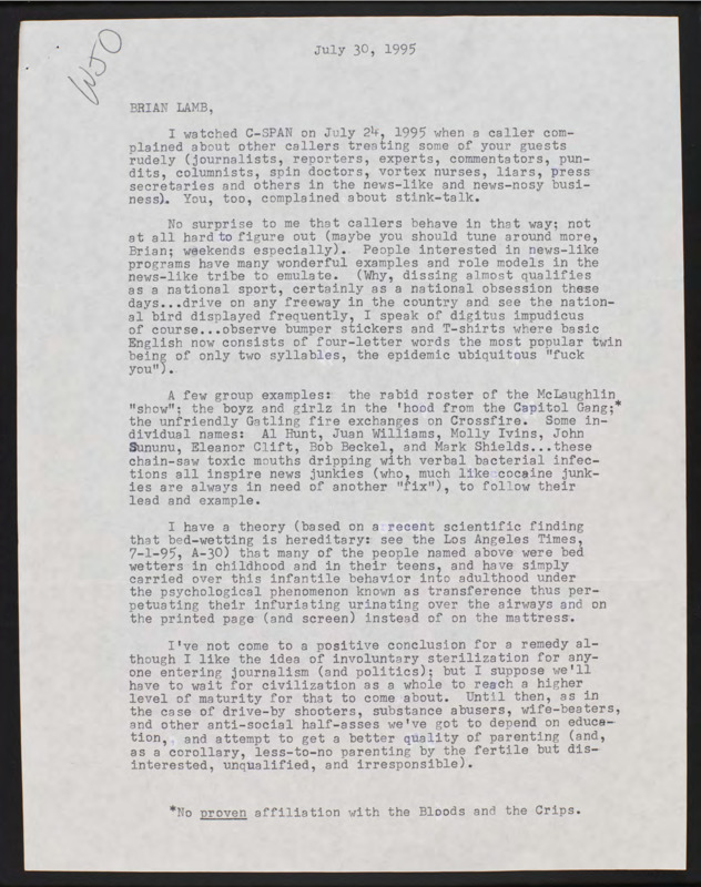 Letter to C-SPAN, 1995-07-30; 93420