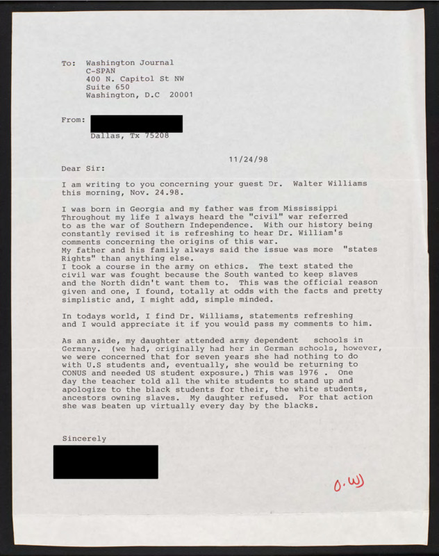 Praises a C-SPAN guest's reference to the Civil War, discusses their education on the reasons behind the Civil War, and gives an example in their children's school when they feel racism toward white children was shown.