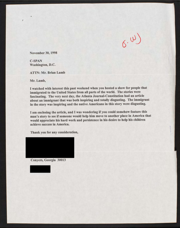 Letter to C-SPAN, 1998-11-30; 30013