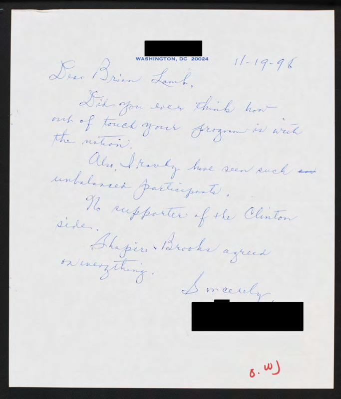 Believes C-SPAN is out of touch and unbalanced, as well as biased against Bill Clinton.