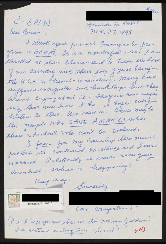 Letter to C-SPAN, 1998-11-27; 96815