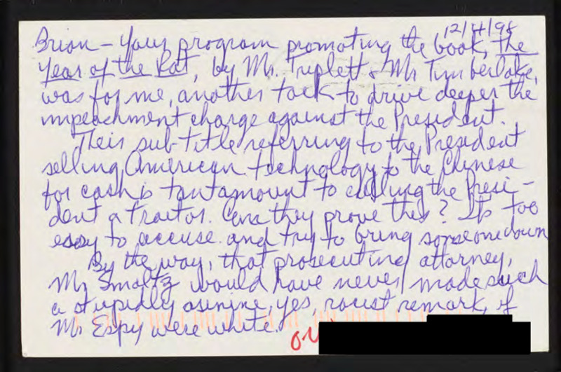 Discusses a book accusing Bill Clinton of many crimes and referencing his impeachment, but questions the validity of the authors' claims.