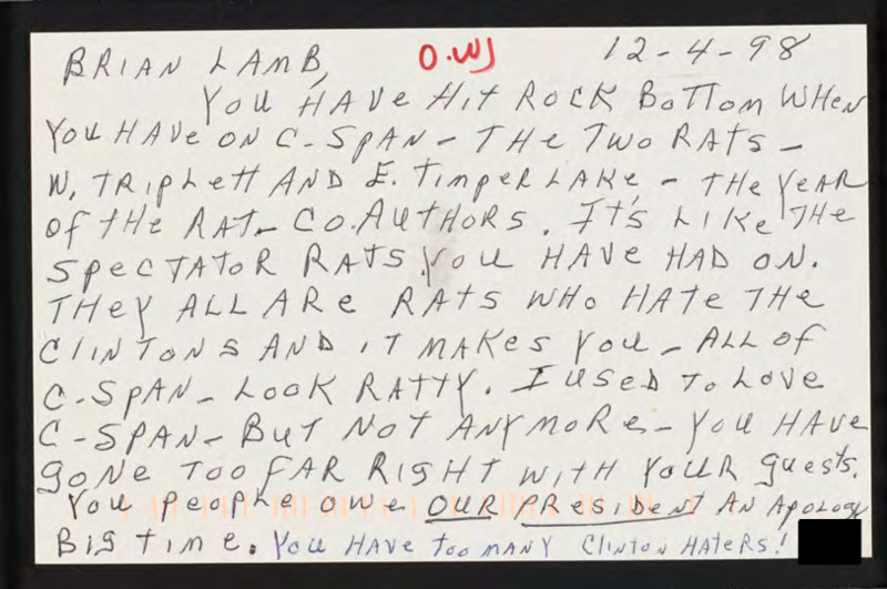 Criticizes two authors who wrote a book disparaging Bill Clinton and disliked having them featured on C-SPAN.