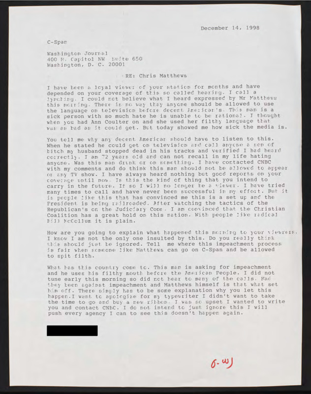 Letter to C-SPAN, 1998-12-14