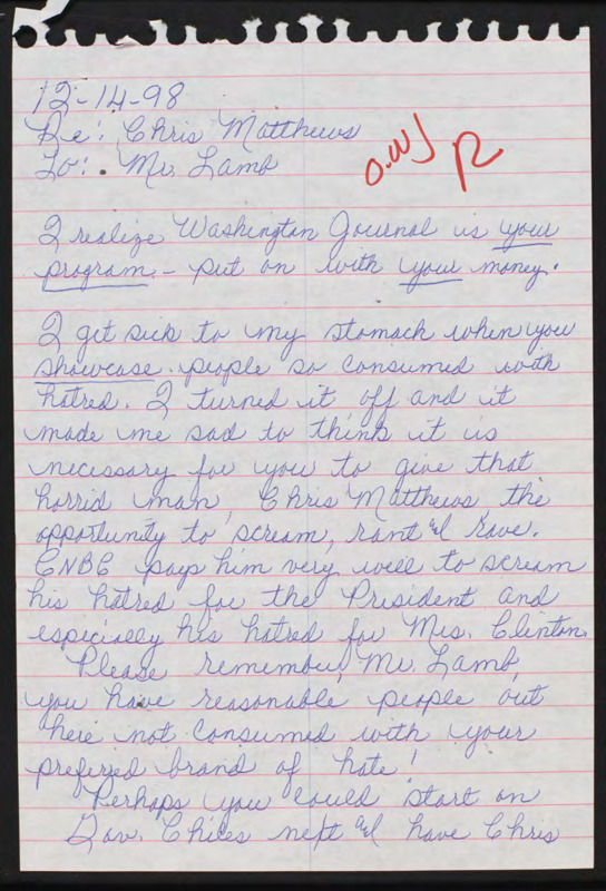 Letter to C-SPAN, 1998-12-14