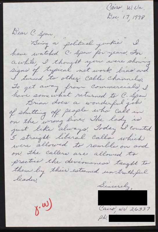 Describes their ambivalence over C-SPAN, praises Brian Lamb, but states dislike that so many liberal callers were allowed to "ramble."